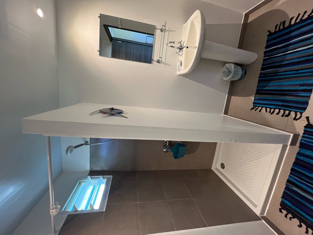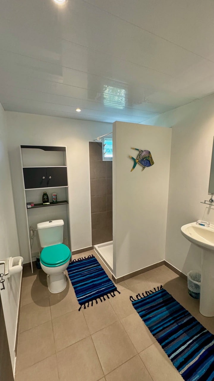 The bathroom has a walk-in shower with hot water, a built-in basin and a toilet.